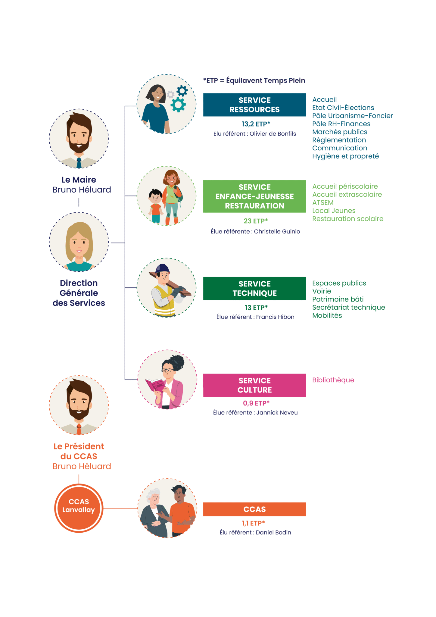 54 agents sont employés par la Mairie de Lanvallay au sein de différents services : service ressources, service enfance-jeunesse-restauration, services techniques, bibliothèque et centre communal d’action sociale.